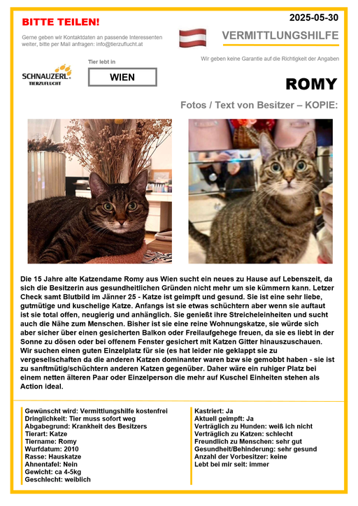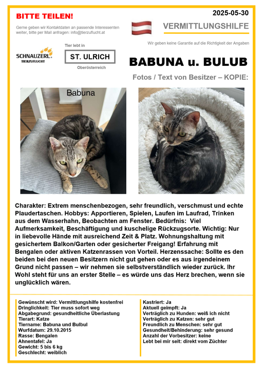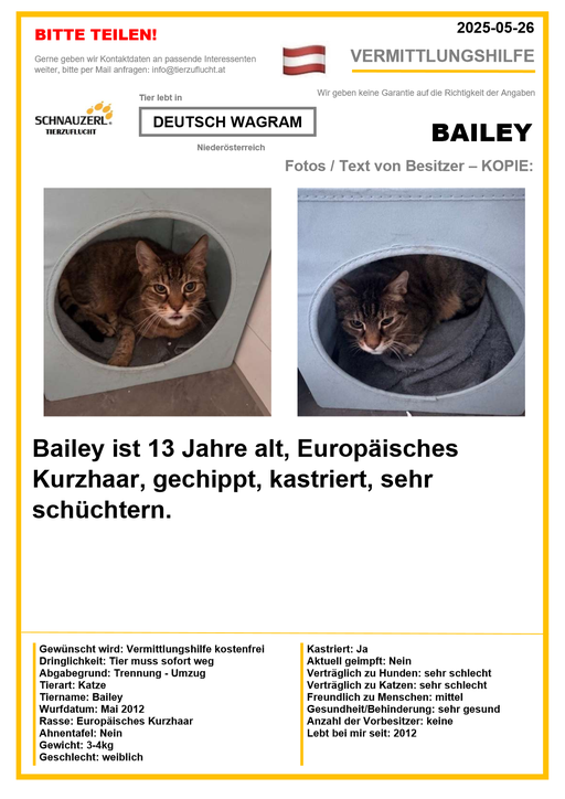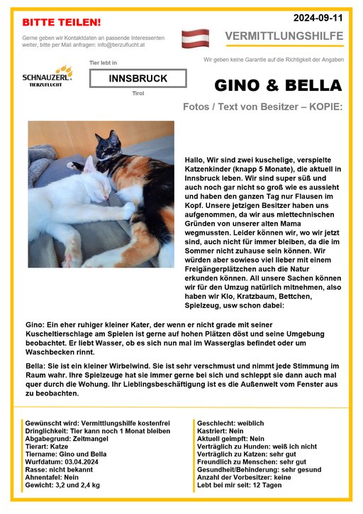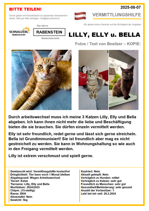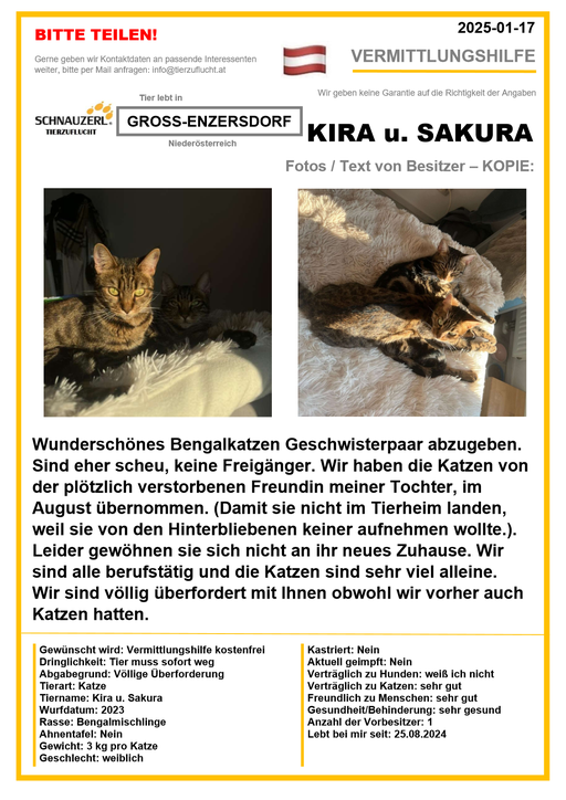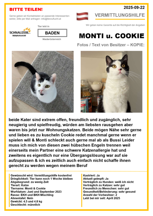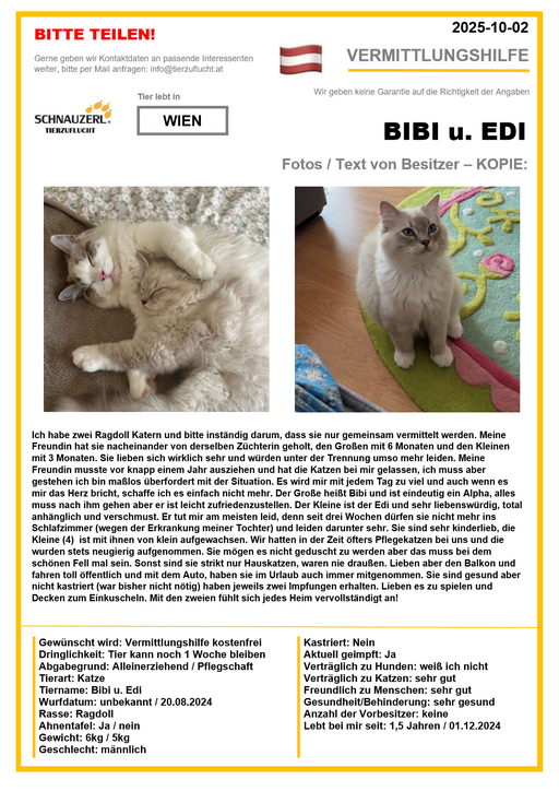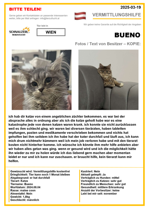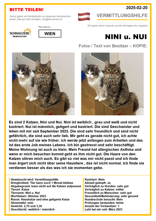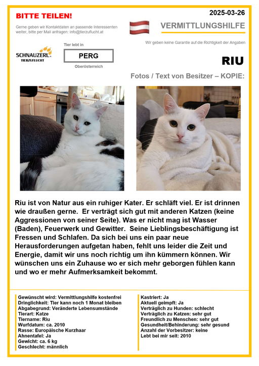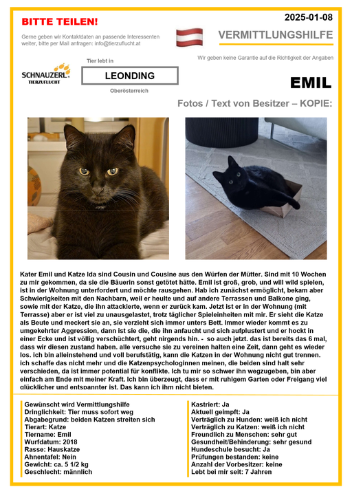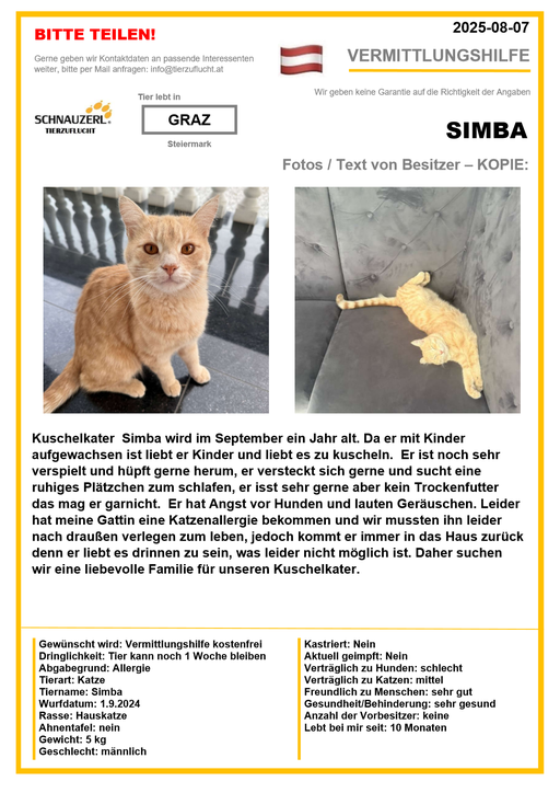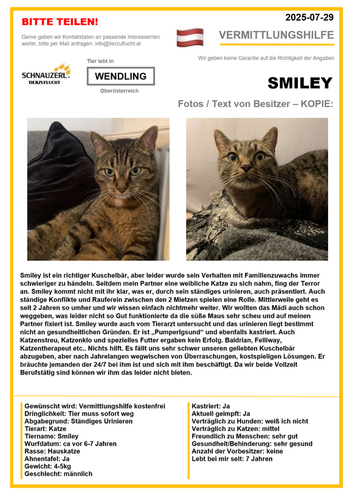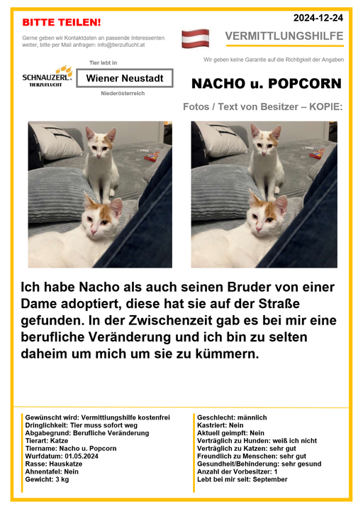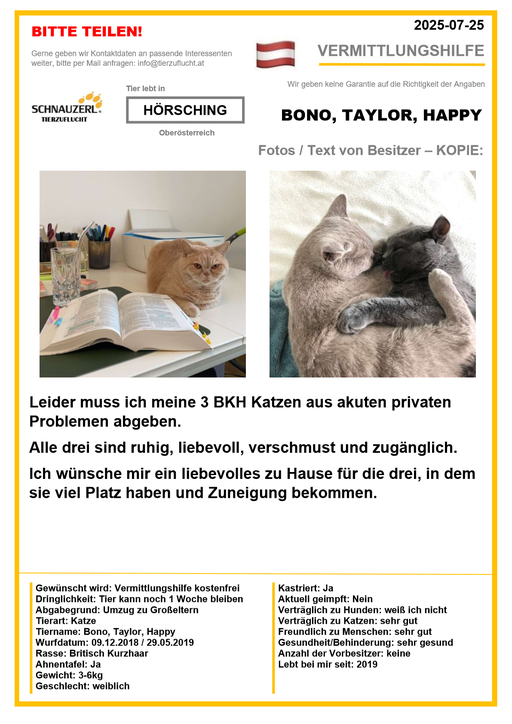 Hier finden Sie Katzen der letzten drei Monate aus Privathaushalten, die ein neues Zuhause suchen. Diese Katzen sind NICHT in unserer Obhut. Wir helfen gerne kostenfrei und geben maximal fünf Kontaktdaten von Interessenten an den Eigentümer weiter. Für die Wahrhaftigkeit der Texte können wir KEINE Garantie geben. Wir kennen hier grundsätzlich weder Tier, Halter noch Interessenten. Es erfolgt keine Überprüfung seitens SCHNAUZERL und wird keine Haftung für Qualität oder Wahrheitsgehalt der Einträge und Korrespondenz übernommen.