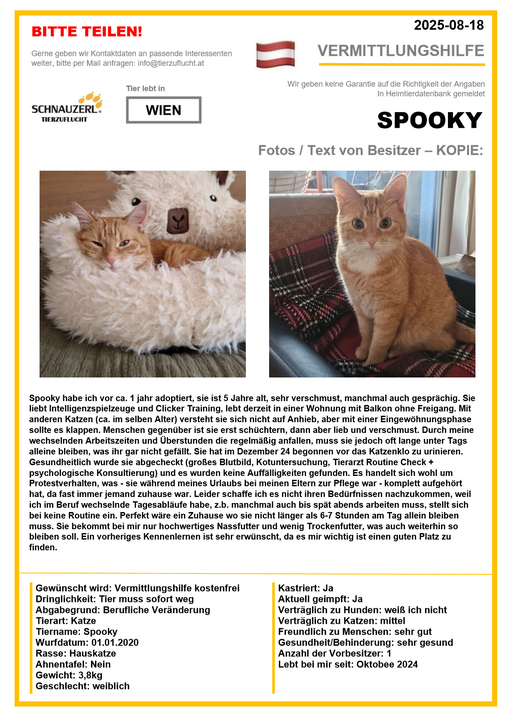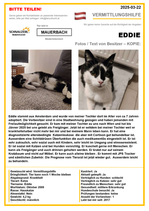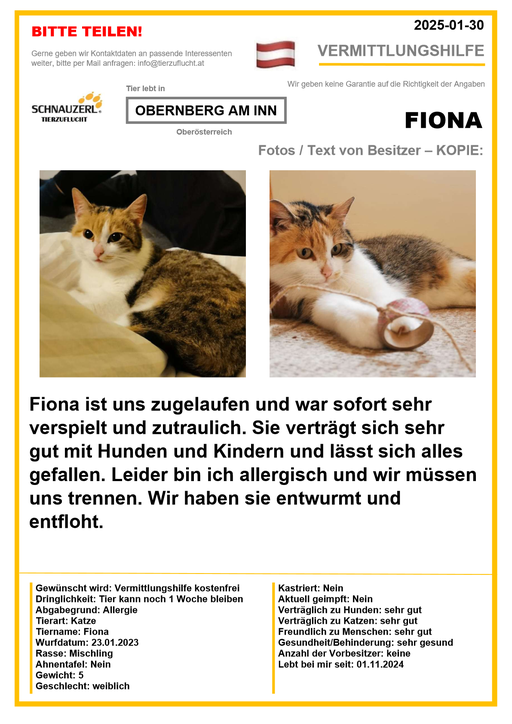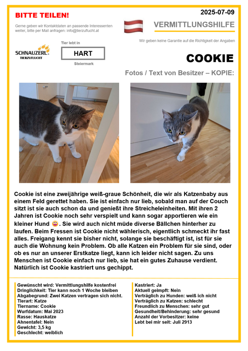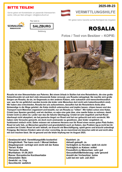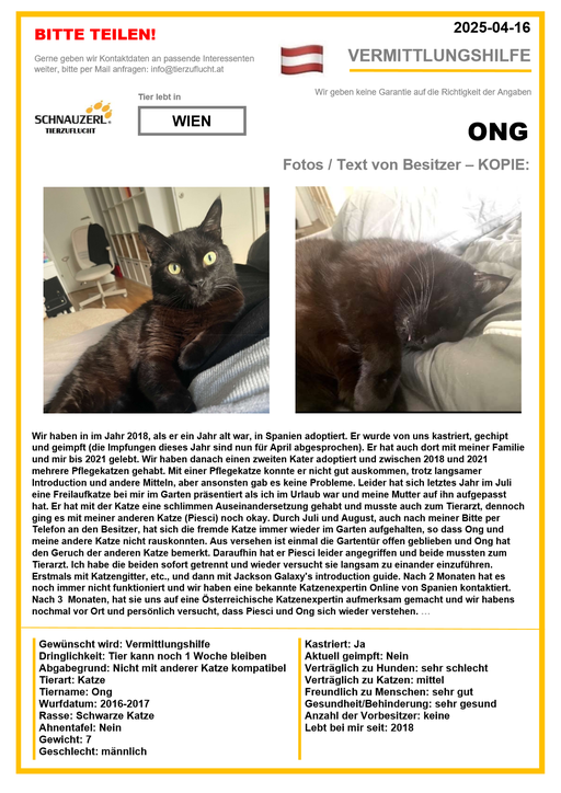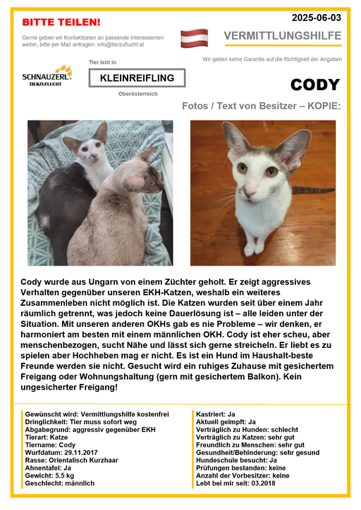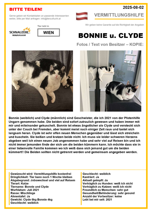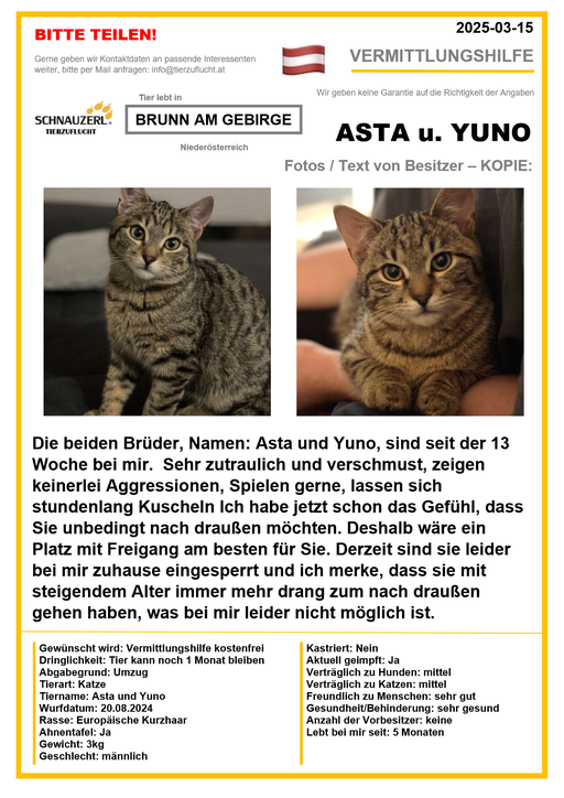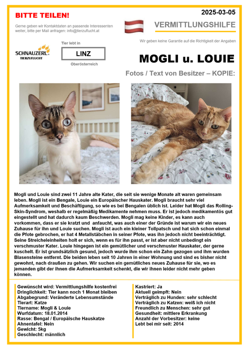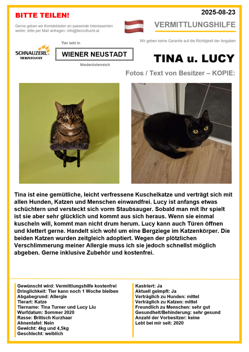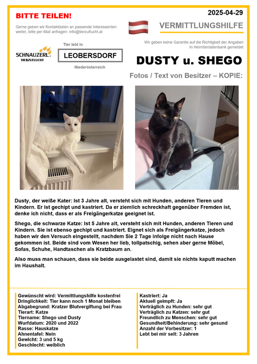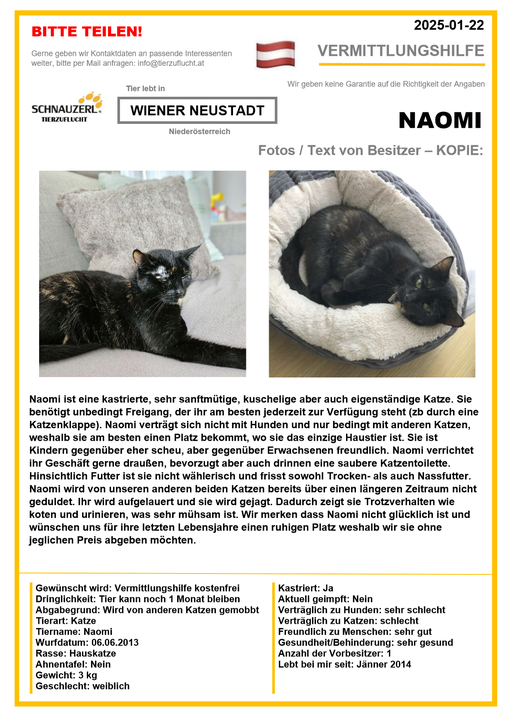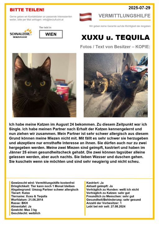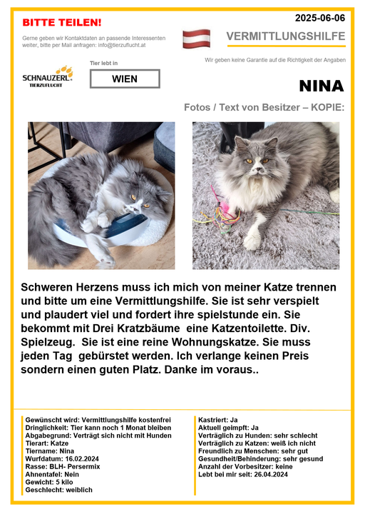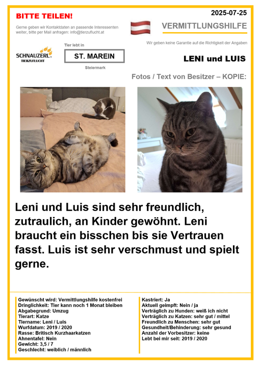Hier finden Sie Katzen der letzten drei Monate aus Privathaushalten, die ein neues Zuhause suchen. Diese Katzen sind NICHT in unserer Obhut. Wir helfen gerne kostenfrei und geben maximal fünf Kontaktdaten von Interessenten an den Eigentümer weiter. Für die Wahrhaftigkeit der Texte können wir KEINE Garantie geben. Wir kennen hier grundsätzlich weder Tier, Halter noch Interessenten. Es erfolgt keine Überprüfung seitens SCHNAUZERL und wird keine Haftung für Qualität oder Wahrheitsgehalt der Einträge und Korrespondenz übernommen.
